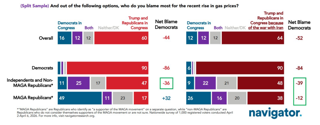 Washington, DC – With less than seven months until the midterm elections, the news just keeps getting worse for vulnerable Republicans hoping to keep their jobs this November. After Democrats made significant gains in elections from Georgia to Wisconsin on Tuesday, polling from Navigator Research shows that 60% of voters blame Trump and Republicans for the recent rise in gas prices.