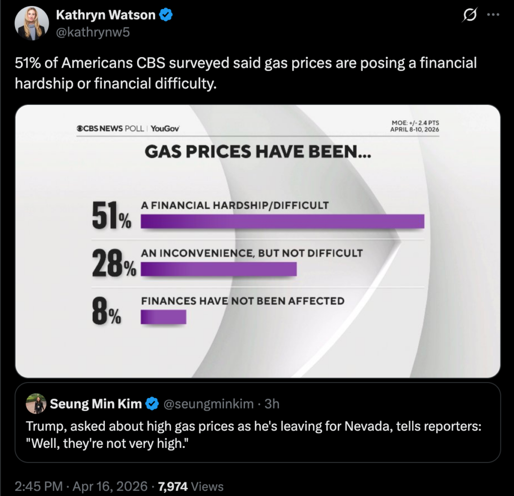 Washington, DC – A new poll from CBS News shows that, as desperately as Trump and his henchmen try to convince people otherwise, a majority of Americans are struggling amid skyrocketing gas prices. With approval ratings at record lows, you’d think that the Trump administration would be laser-focused on addressing their concerns. Instead, they’re doubling down on pretending that everything is okay, getting in fights with the pope and directing their attention to building a 250-foot arch that will cost taxpayers millions of dollars.