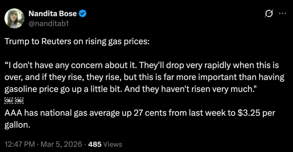 SHOT: Trump is telling Americans to quit whining about soaring gas prices because the war he started is “far more important.”